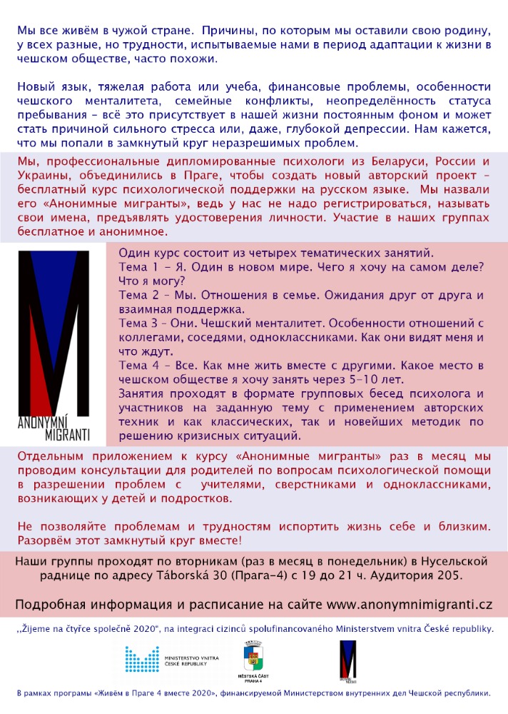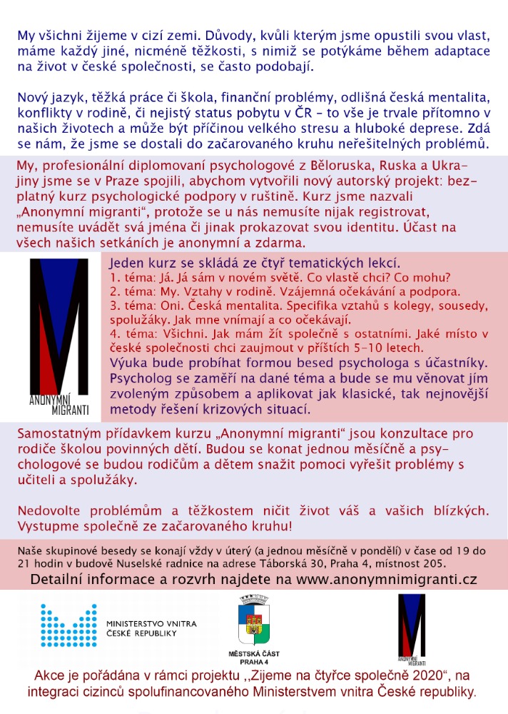 14. června 2020 se rozběhne zajímavý a velmi důležitý integrační projekt „Anonymní migranti“. Soustředí se na psychologickou podporu imigrantů z Běloruska, Kazachstánu, Ruska a Ukrajiny.