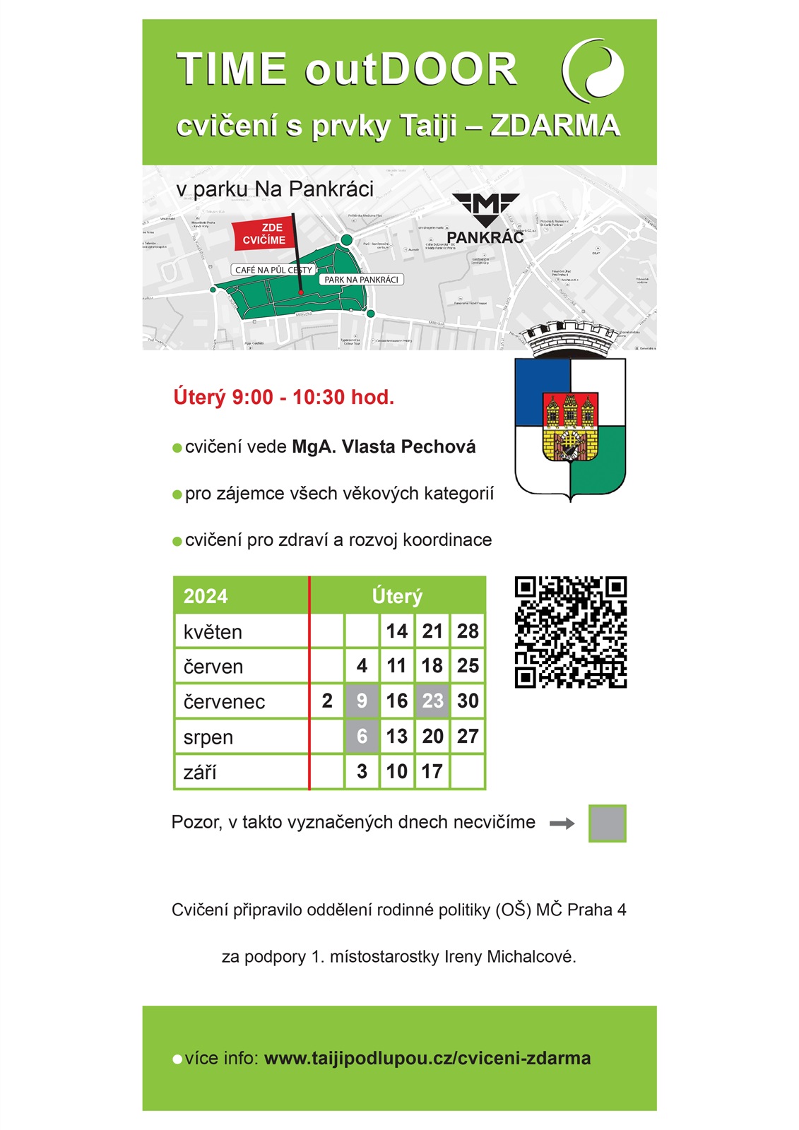 Cvičení s prvky Tai chi je určeno osobám všech věkových kategorií i fyzických dovedností. Probíhá každé úterý dopoledne, a to v čase 9 – 10.30 hod. v parku Na Pankráci (naproti kavárně Na půl cesty) pod vedením lektorky MgA. Vlasty Pechové.