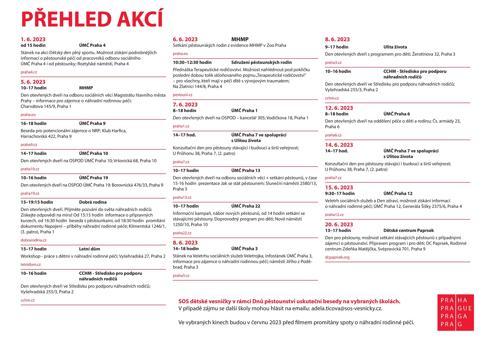 Program zahrnuje besedy a diskuse s odborníky, setkání s pěstouny, dny otevřených dveří v pražských neziskových organizacích na úřadech městských částí a další akce, které se budou konat na různých místech v metropoli.