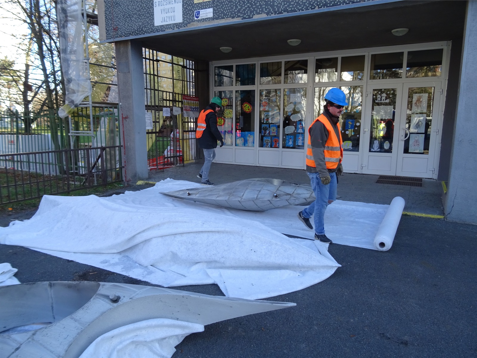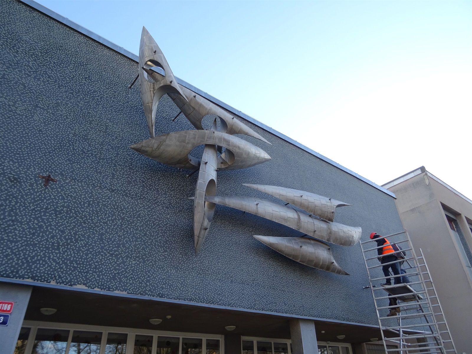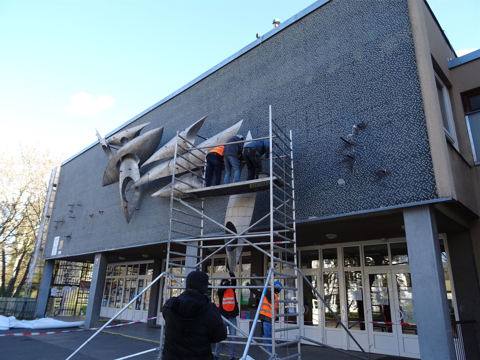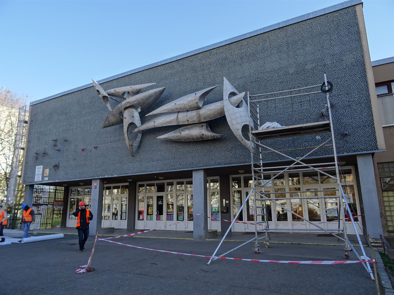 Plastika Vazby se po restaurování vrátí zpět na fasádu ZŠ Filosofská