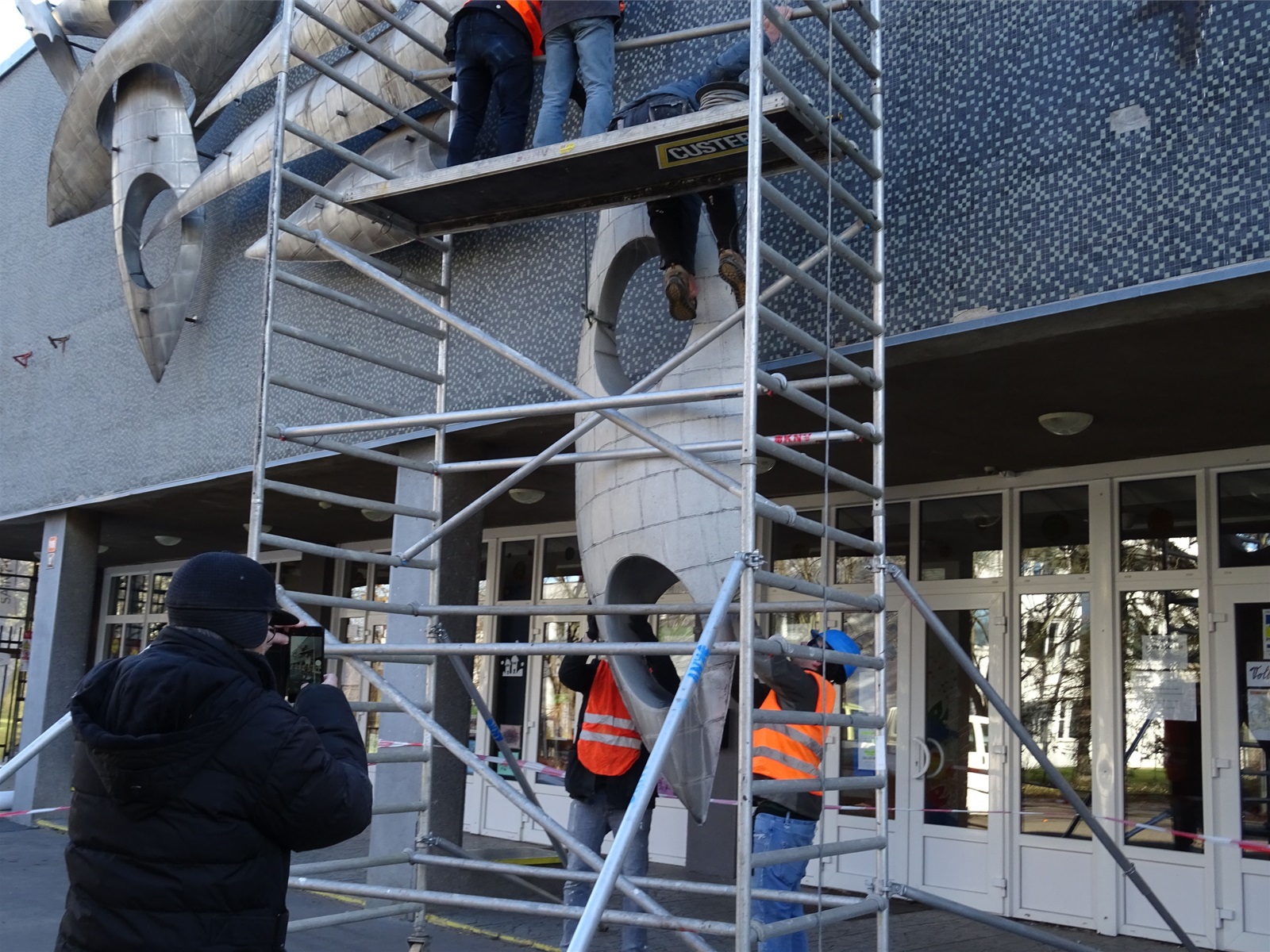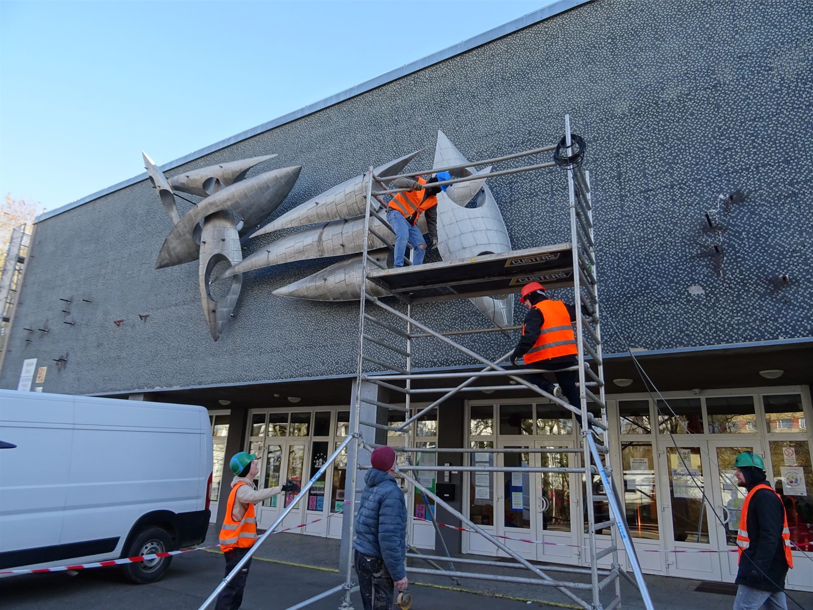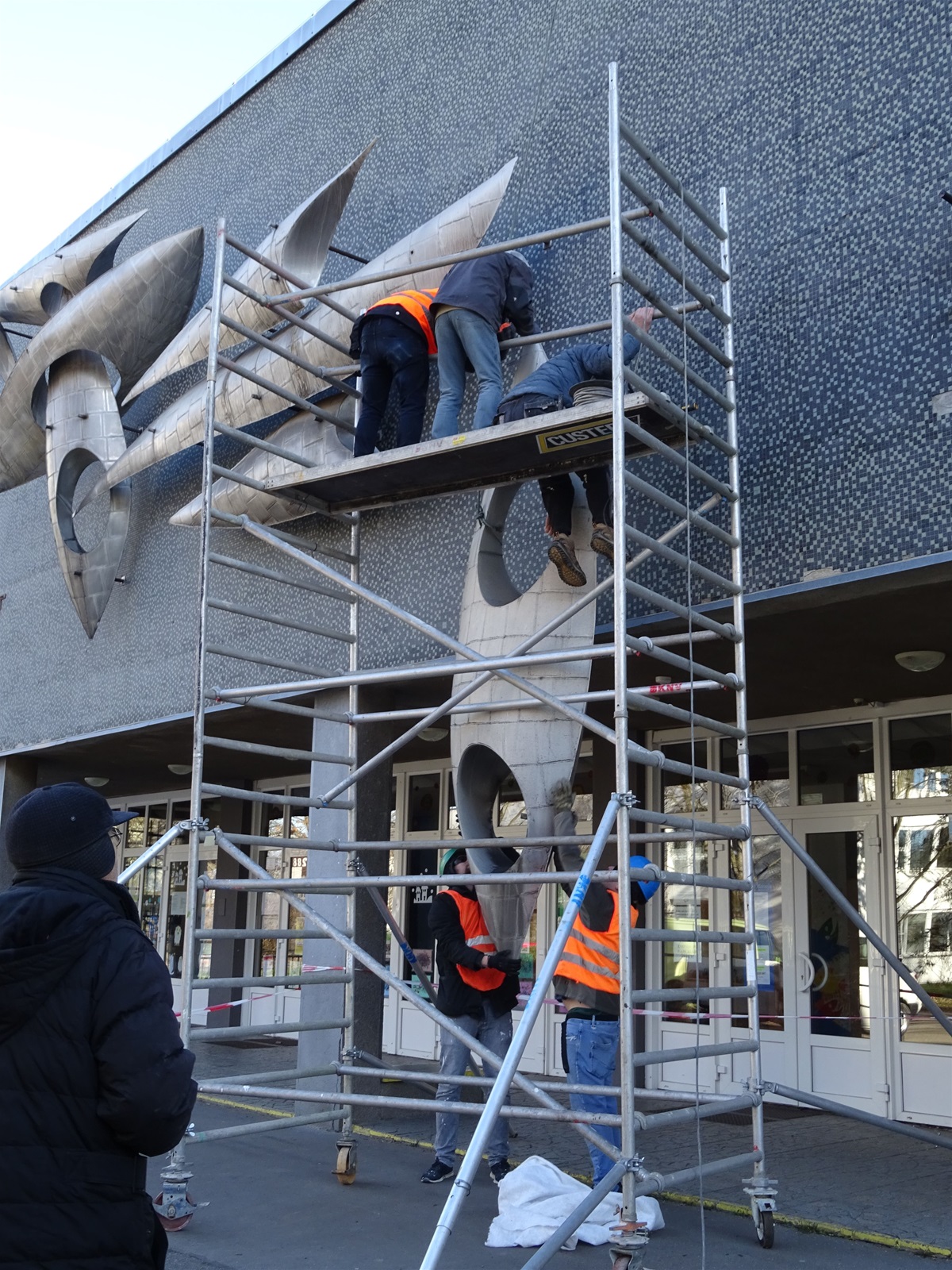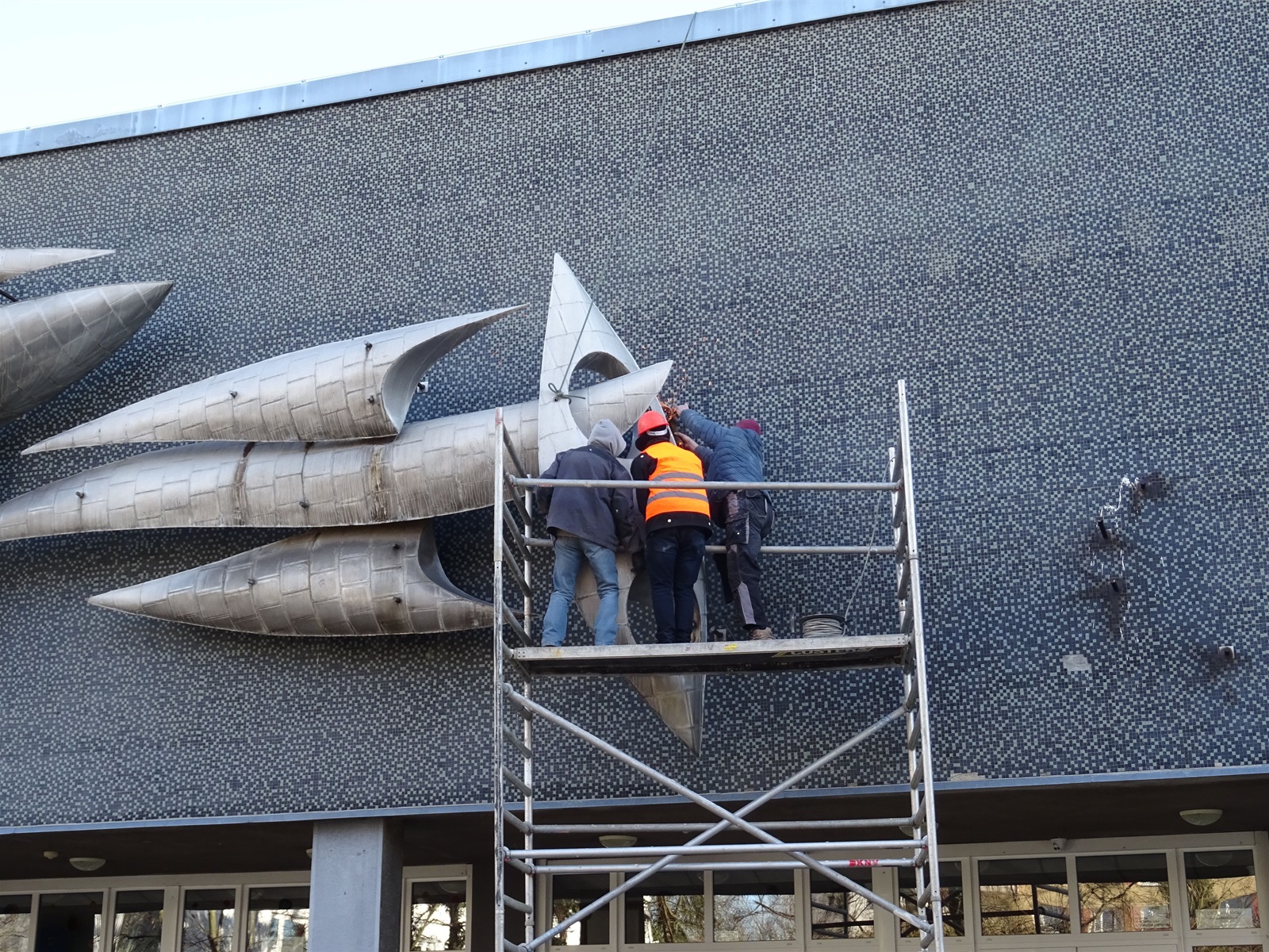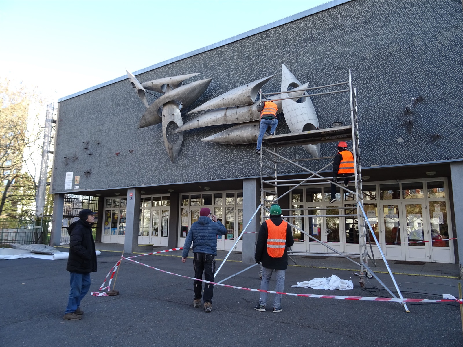 Plastika Vazby se po restaurování vrátí zpět na fasádu ZŠ Filosofská