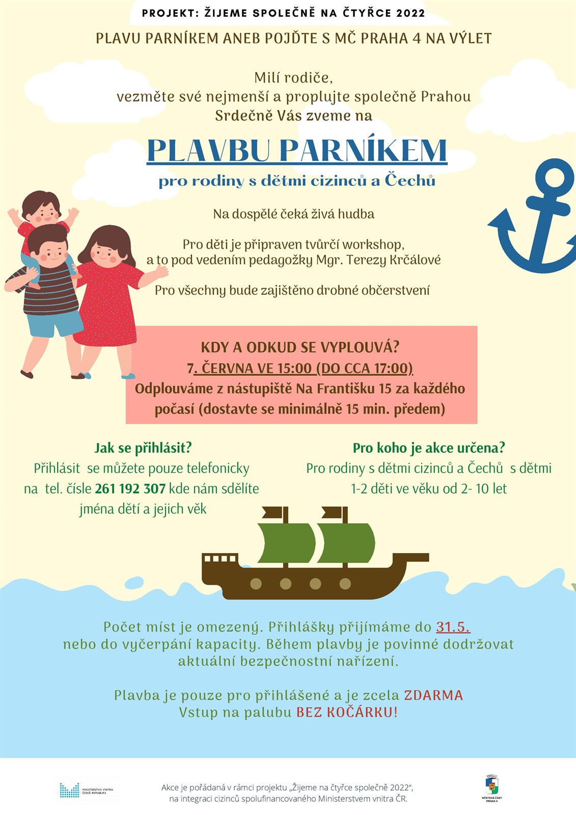 Výletní plavba po Vltavě pro rodiny cizinců i Čechů s dětmi (1-2 děti od 2 do 10 let) se uskuteční 7. června 2022 v době od 15 do cca 17 hod. Odplouvá se z přístaviště č. 15 - náplavka při ulici Na Františku (Dvořákovo nábřeží). Pro přihlášené je plavba zdarma. - Na dospělé čeká krásný hudební program a karaoke a pro děti je připravený dětský program pod vedení naší pedagožky Mgr. Terezy Krčálové.