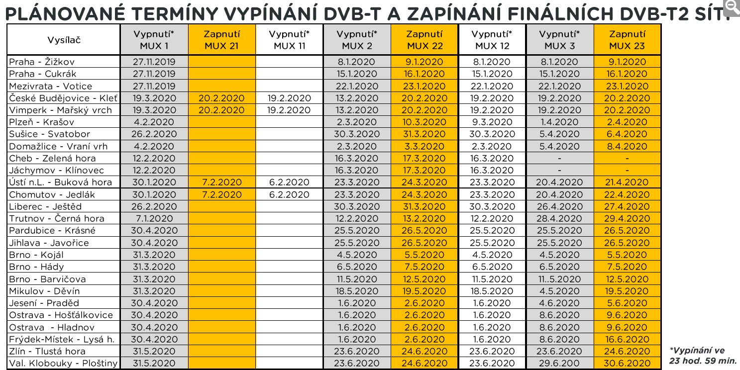 Jako první vypnou 27. listopadu 2019 své stávající vysílání ve starém standardu DVB-T vysílače Žižkov a Cukrák, jejichž signál přijímá řada domácností v Praze a středních Čechách. A hned v další vlně, tedy 7. ledna 2020, se definitivně na nový standard DVB-T2 přeladí i vysílač Černá hora, což se dotkne řady obcí ve východních Čechách.