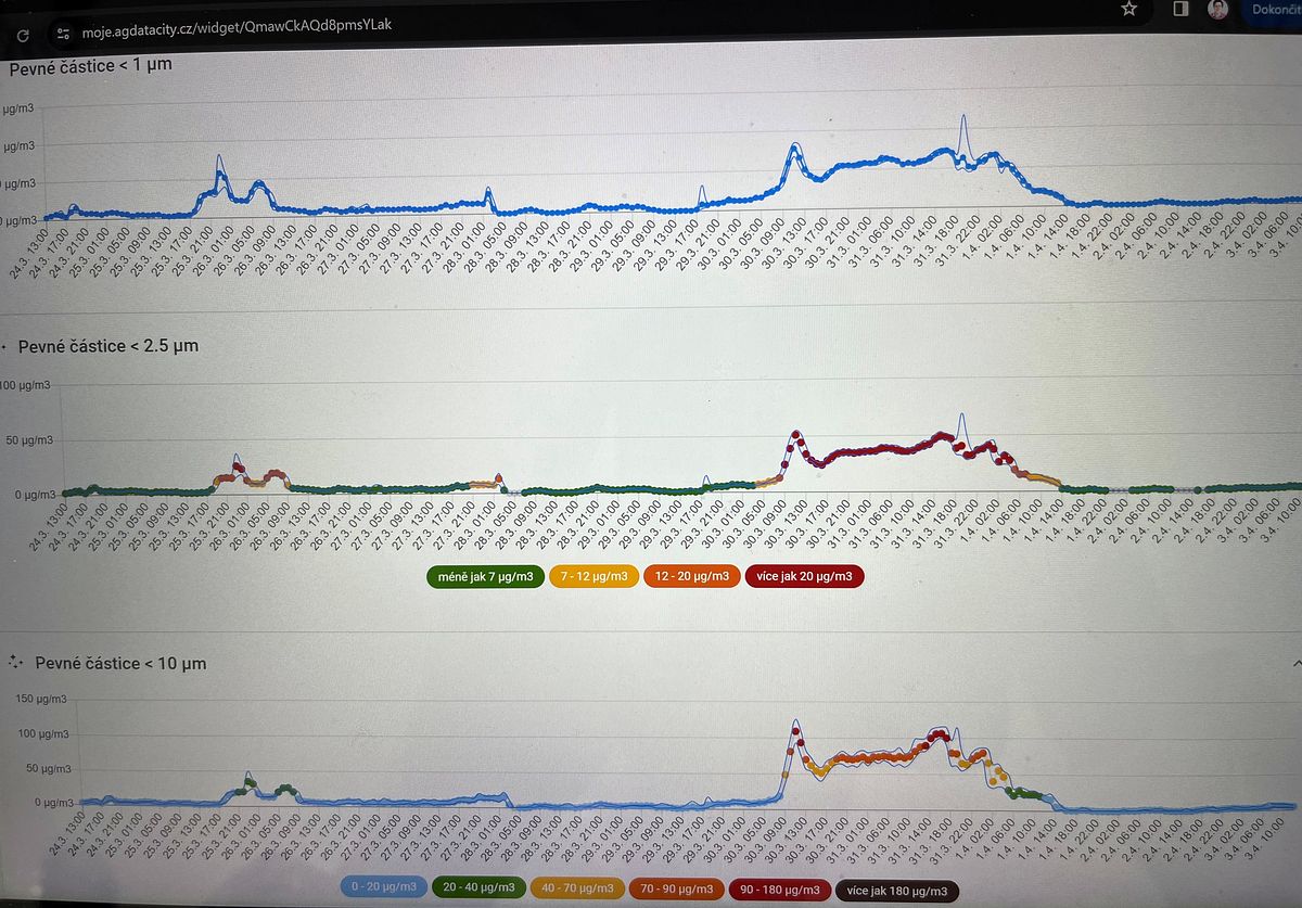 Horní graf je ze ZŠ Školní, dolní ze ZŠ Filosofská. Jsou na nich dobře vidět vyšší koncentrace prachu u ZŠ Filosofská, která, byť jsou stanice od sebe jen 1940 m, leží o 70 m výše.