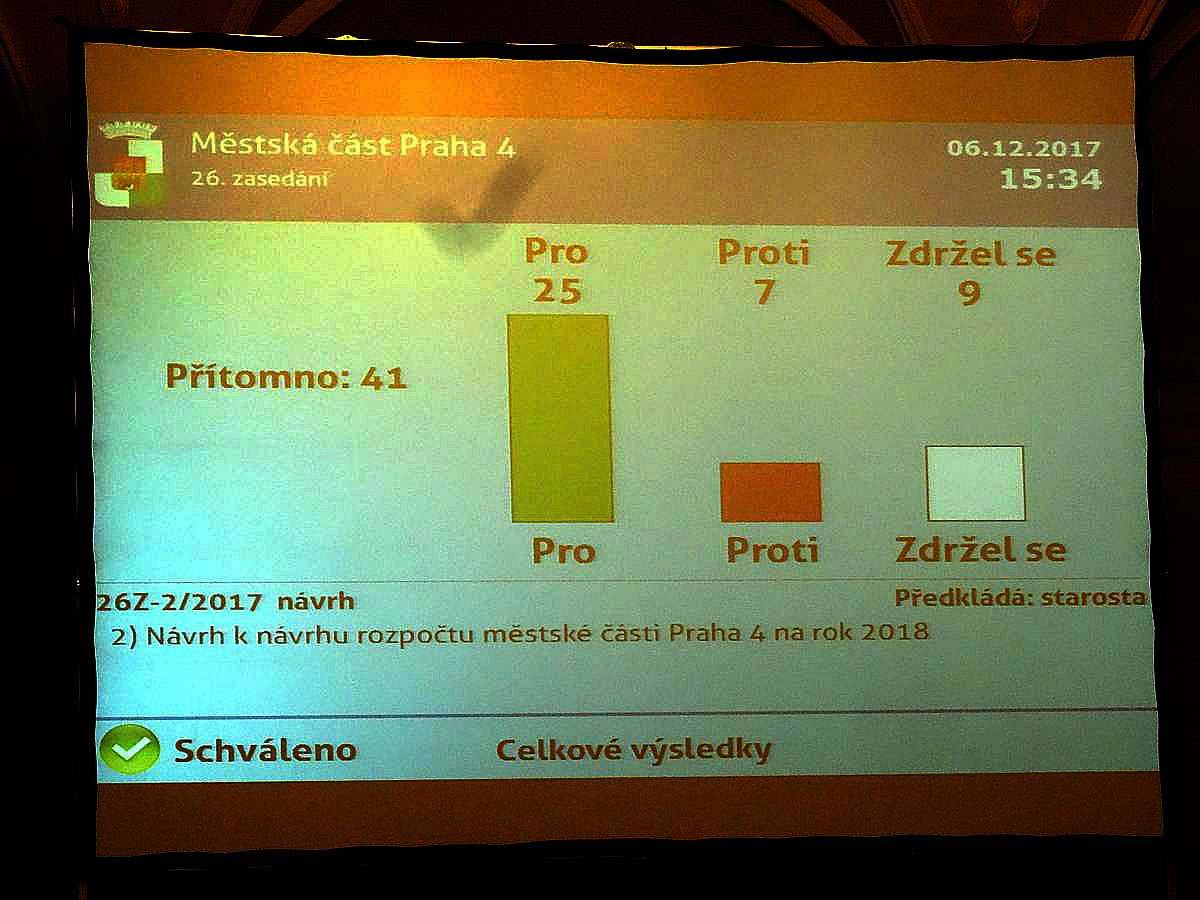 Zastupitelstvo městské části Praha 4 dnes jako první městská část v hlavním městě schválilo rozpočet městské části na rok 2018. Praha 4 bude podle něj v příštím roce hospodařit s rozpočtem ve výši téměř 1 miliardy korun a její hospodaření bude vyrovnané.