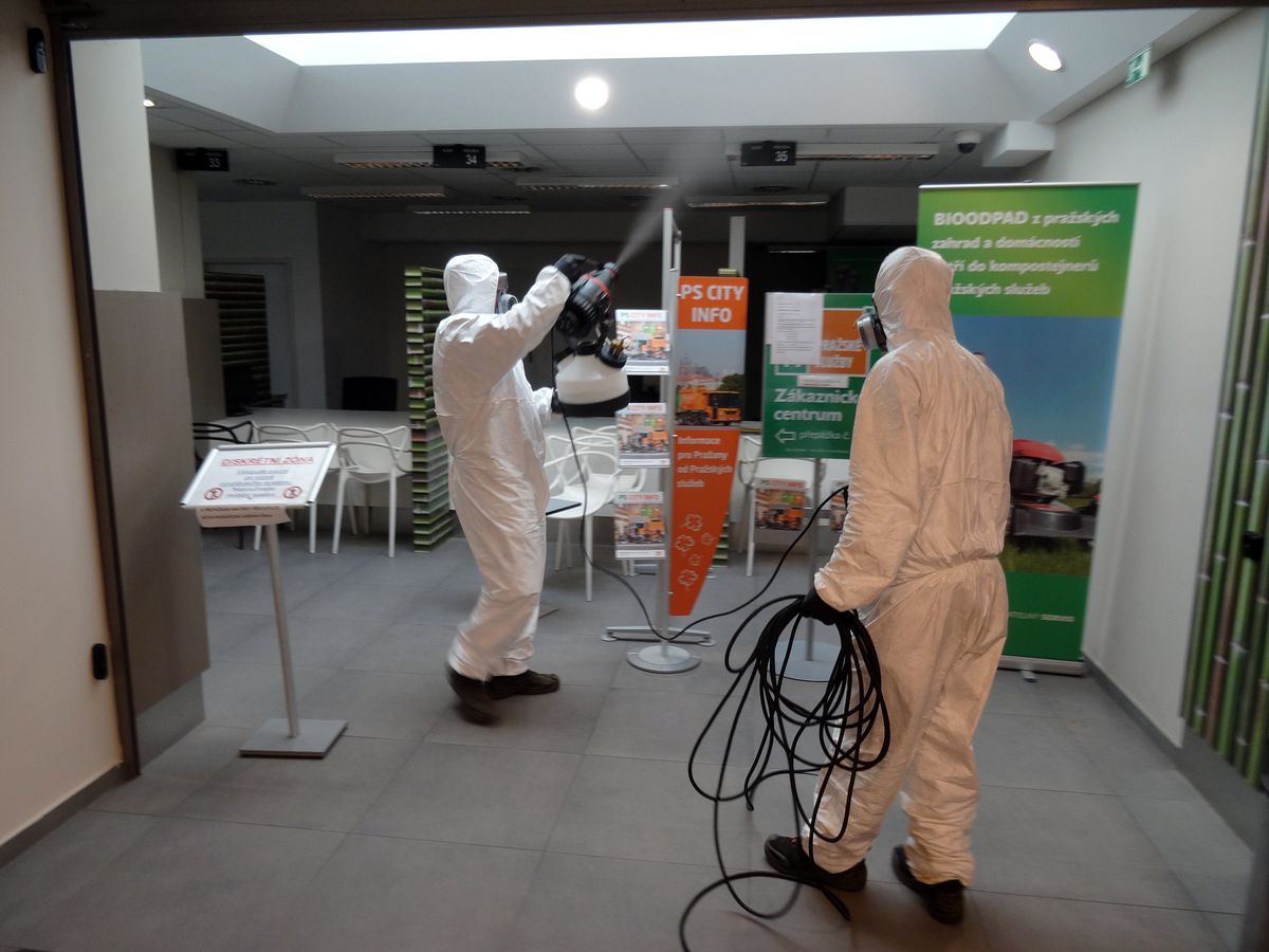 Pravidelně je aplikována dezinfekce v přízemí budovy Úřadu MČ Praha 4.