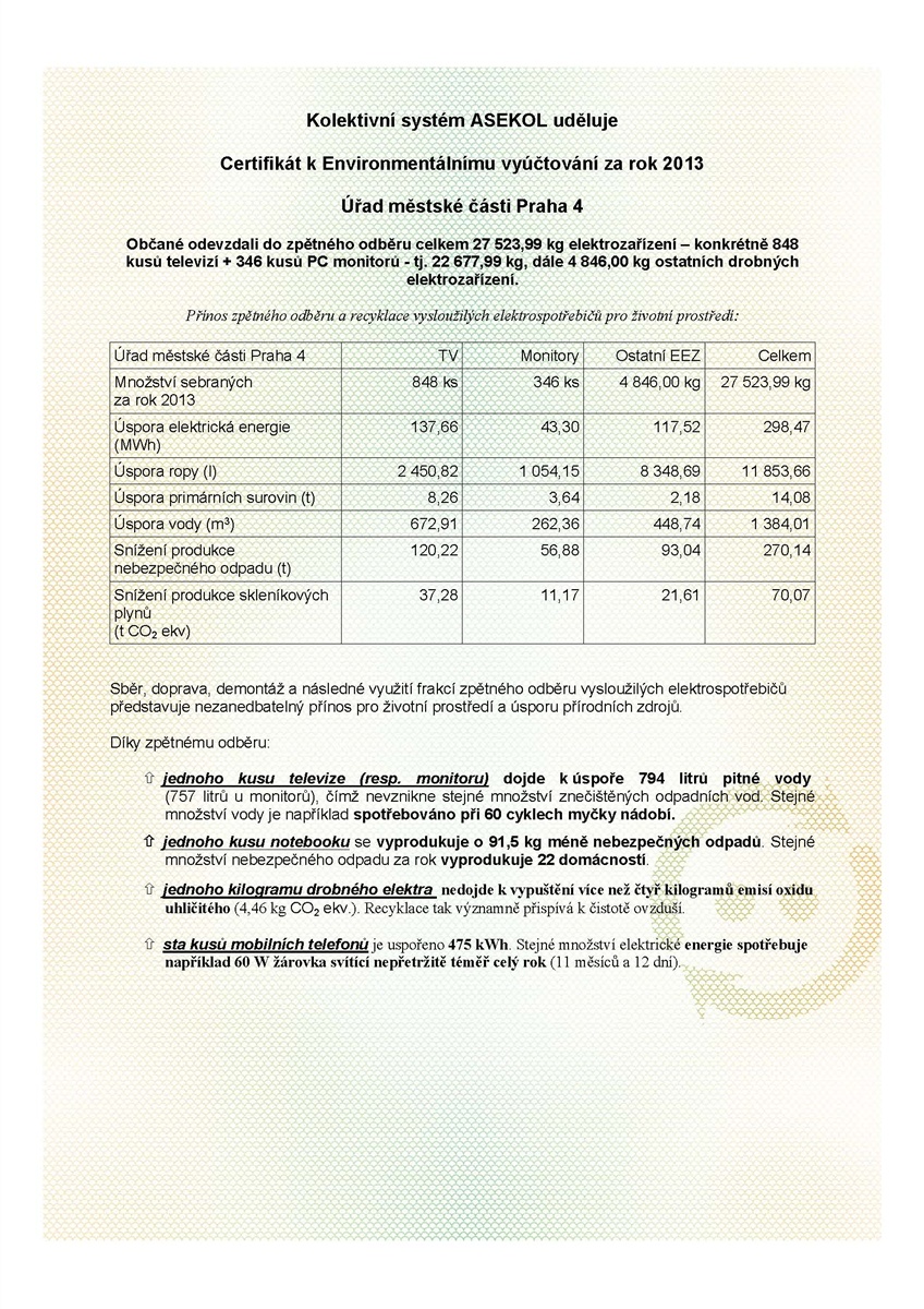 Obyvatelé městské části Praha 4 již několik let zodpovědně třídí elektroodpad. Nyní můžeme přesně vyčíslit, kolik elektrické energie, ropy, uhlí, primárních surovin či vody jsme díky recyklaci ušetřili životnímu prostředí. Víme také, o kolik jsme snížili produkci skleníkových plynů nebo nebezpečného odpadu. Informace vycházejí ze studií neziskové společnosti ASEKOL, která pro nás zajišťuje sběr a recyklaci vytříděných elektrozařízení. Naše obec získala certifikát vypovídající nejen o přínosech třídění televizí a počítačových monitorů, ale také o významu sběru drobných spotřebičů.