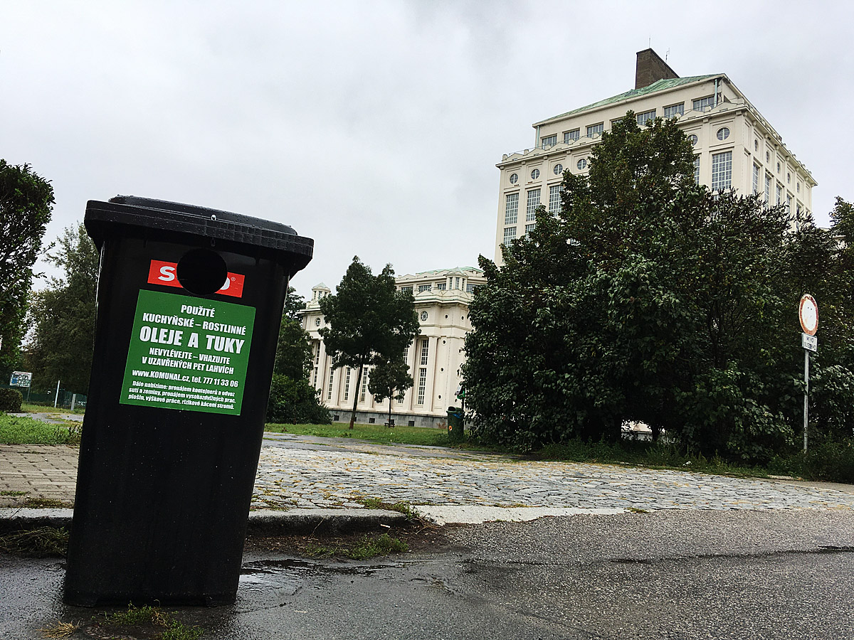Kontejner pro ukládání použitých kuchyňských olejů a tuků v Podolské ulici.