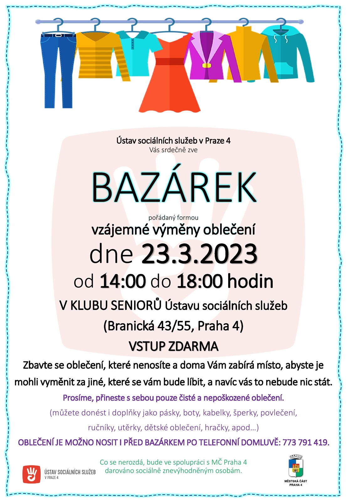 Přijďte si vybrat nový kousek do šatníku nebo přineste již odložené oblečení, které Vám zabírá místo, ale stále je pěkné. Přinést můžete také doplňky – kabelky, pásky, obuv nebo třeba utěrky, ručníky a povlečení. Přijímáme také dětské oblečení a hračky.