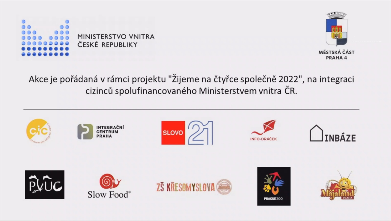 Žijeme na čtyřce společně 2022 - Ohlédnutí za úspěšným rokem Pojďme si připomenou projekt „Žijeme na čtyřce společně 2022 “ a všechny aktivity v oblastech jako je vzdělávání, kulturní a komunitní práce. Velké díky patří nejen Ministerstvo vnitra ale i MČ Praha 4. Důležitá byla také spolupráce s neziskovým sektorem a to konkrétně s těmito subjekty: Centrum pro integraci cizinců/Centre for integration of foreigners , Integrační centrum Praha / Integration centre Prague , Slovo 21, z.s. , InBáze, z. s. , INFO-DRÁČEK , TamdaMedia.eu , Slow Food Prague , Ukrajinská iniciativa v ČR , Asie vzdálená a blízká , MŠ Matěchova , Základní škola Křesomyslova . Poděkování také patří našim tlumočníkům a překladatelům: Iryna Bobyr, Alejandro Bonaccorso a našim externím pracovníkům, jakožto i všem lidem v pozadí.. Všem Vám moc děkujeme a těšíme na pokračování projektu i v roce 2023. Velké poděkování zpracovateli dokumentu a všech mediálních výstupů panu Františku Bikárovi, který pracuje v ROMEA TV .Aktivity byly pořádány v rámci projektu "Žijeme na čtyřce společně 2022", který byl zaměřen na integraci cizinců a byl spolufinancován Ministerstvem vnitra ČR a Městskou částí Praha 4.